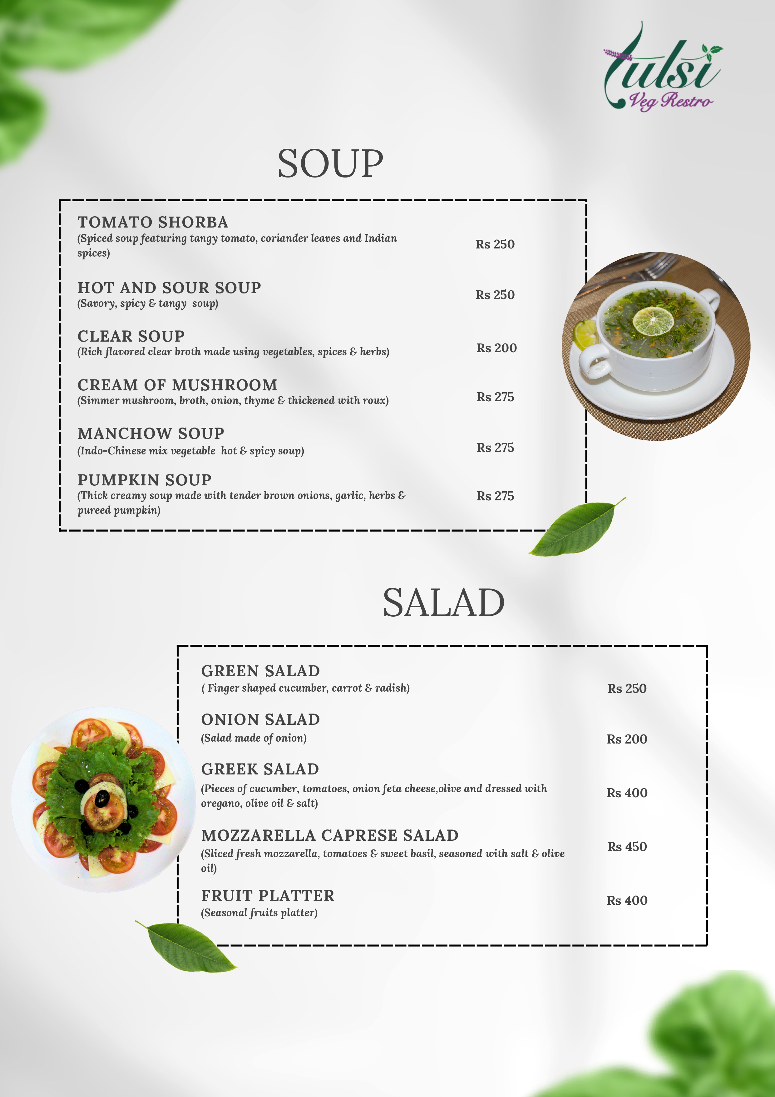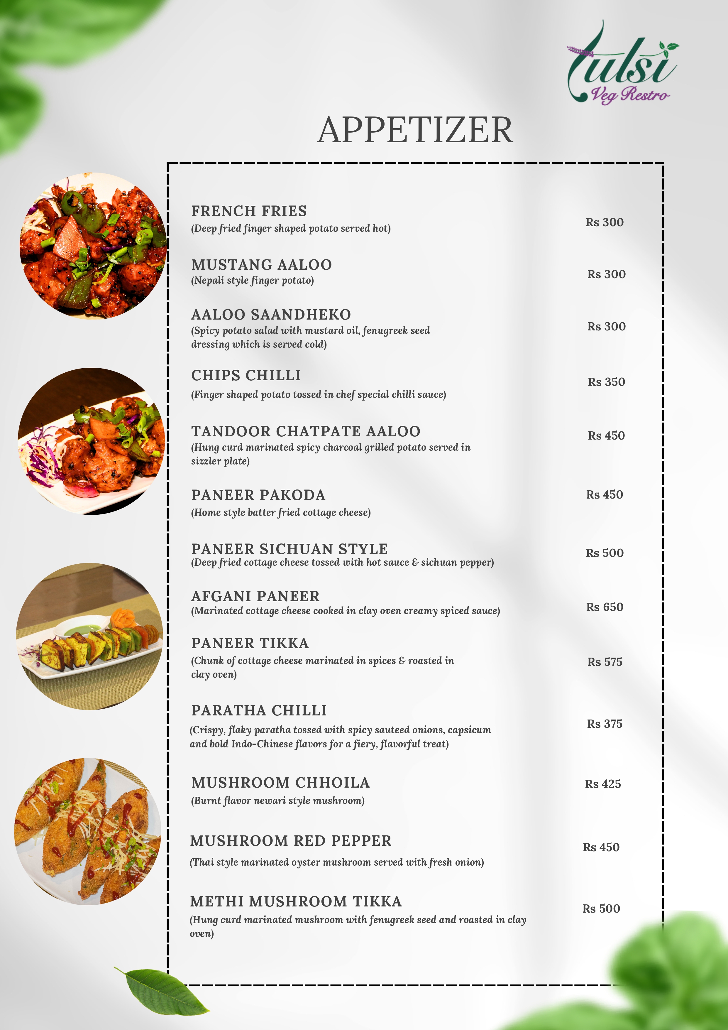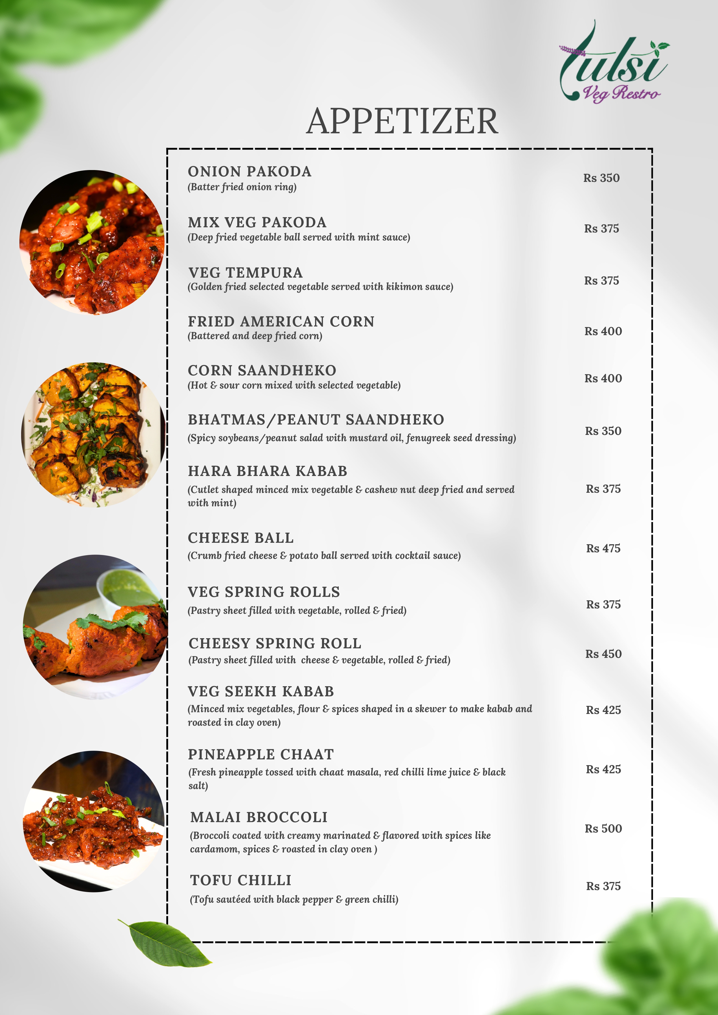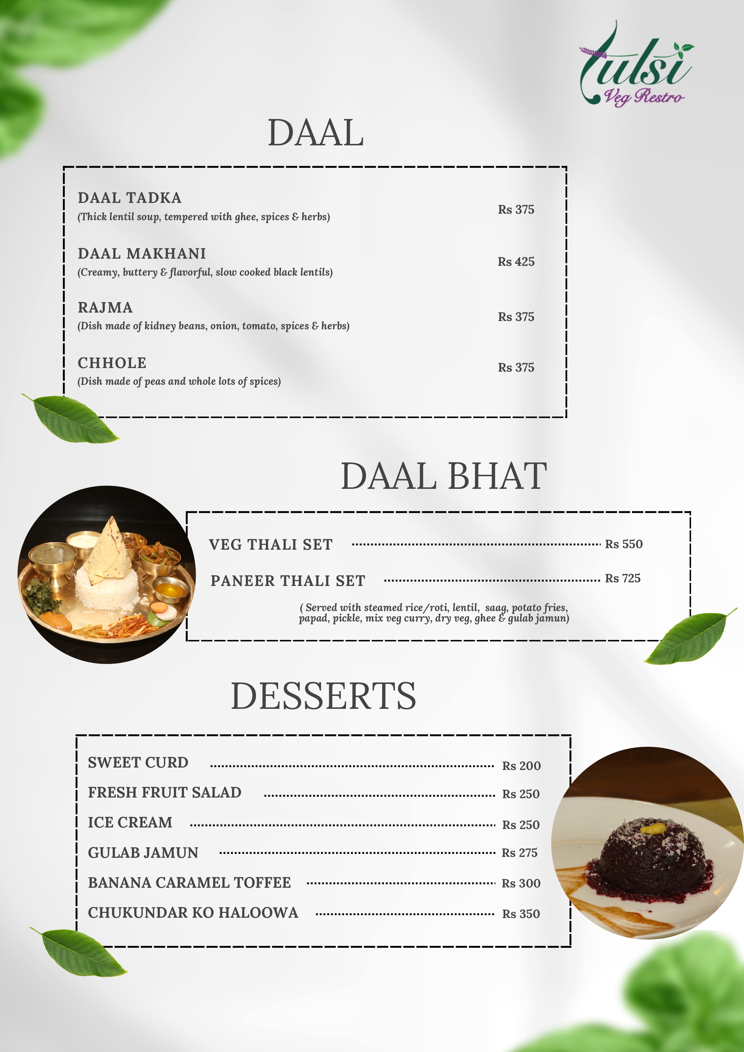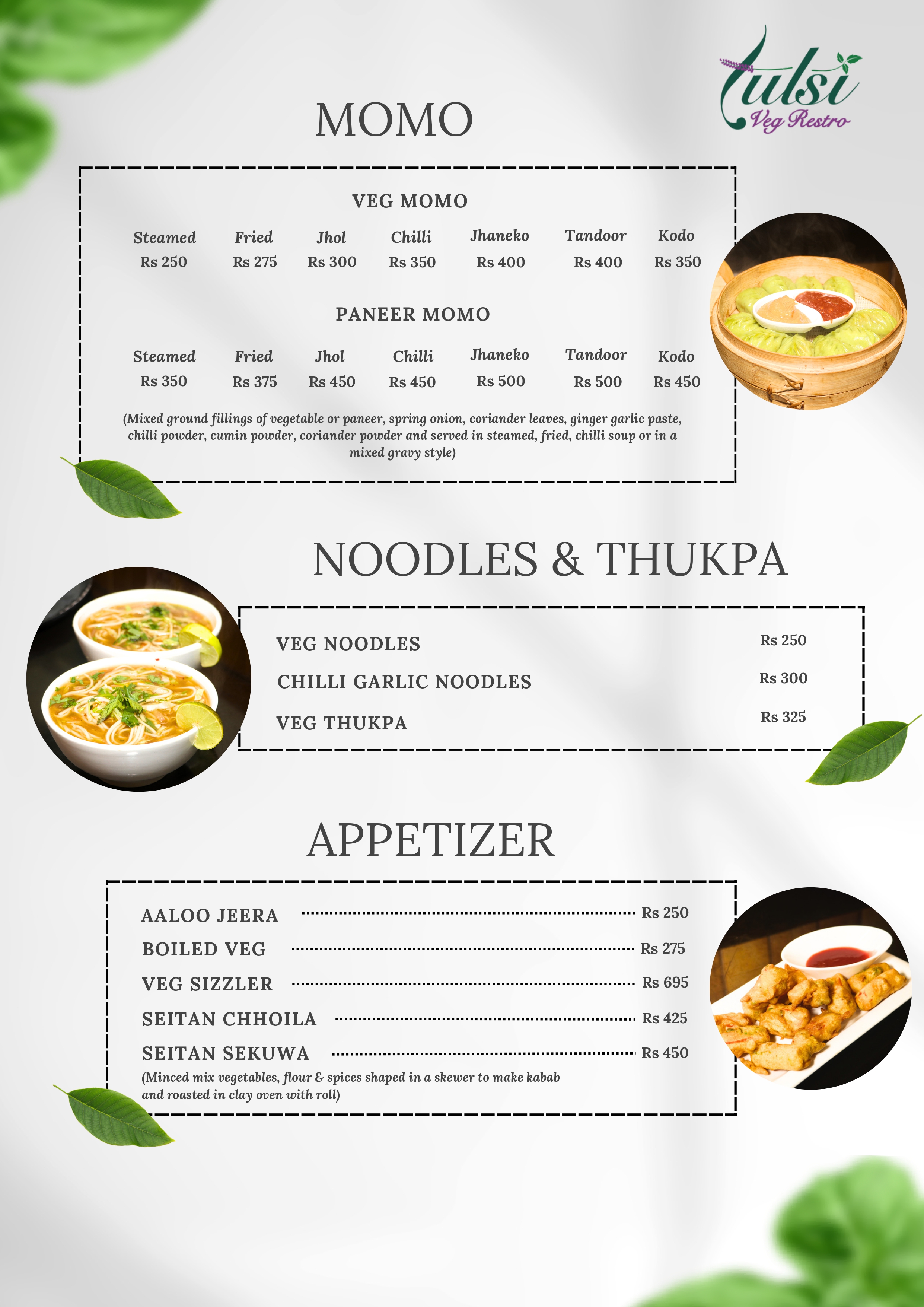 Welcome to Tulsi Veg Restro, your destination for Pure Vegetarian Delights. Nestled in the heart of Thamel at Amrit Marg, Kathmandu, we specialize in Indian, Nepali, and South Asian cuisines. As a joint venture company owned by Mrs. Archana Pandey and Mrs. Manju Pudasaini, our vision is to serve pure, fresh vegetarian foods, promoting public health and saving animal life. Led by our management team, including Mr. Jeevan Pandey of New York Cargo Pvt Ltd and Mr. Raj Kumar Baniya of Dayalaxmi Handicrafts Pvt Ltd, we uphold our motto: Pure Veg! Pure Taste! Pure Health! Join us for a wholesome dining experience that nourishes both body and soul.